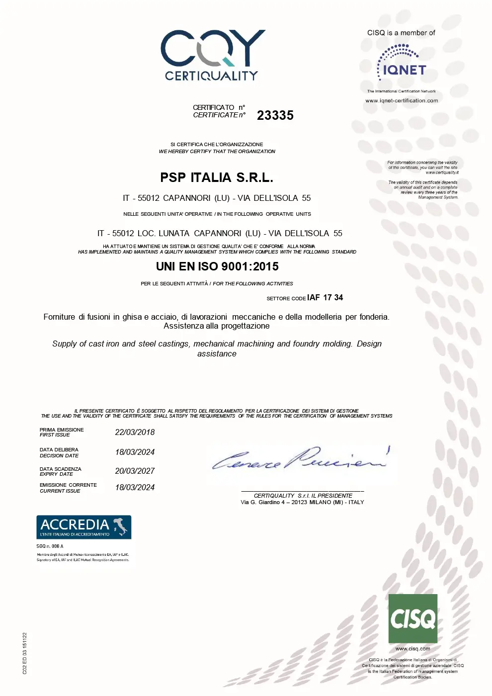 Quality is embedded in our daily operations. PSP Italia is ISO 9001:2015 certified and applies rigorous controls to every batch, with end-to-end traceability.